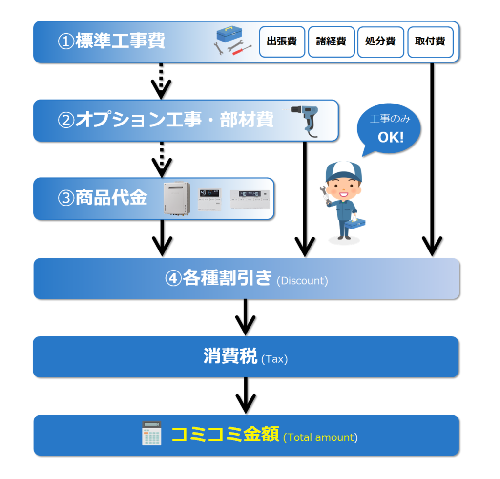 給湯器本体/リモコン代金についてはお客様がご用意頂いた場合は発生しません